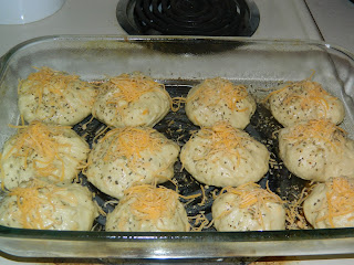 Then I pursed the top of each roll to cover the cheese and pepperoni. Cooking spray went on top, along with basil and oregano, followed by a little bit of shredded cheddar.